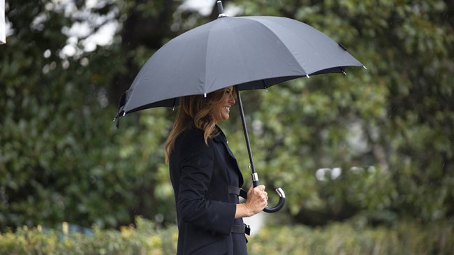 legion-media.ruБазовый коричневый отлично подчеркивает загар первой леди и цвет ее локонов. Многие фэшн-поклонники супруги президента надолго запомнят ее визит во Флориду, куда она прибыла в кашемировом пальто верблюжьего оттенка и такого же цвета сапогах с широким голенищем, добавив образу яркий акцент — красную сумочку. Нет-нет да и изменяет Мелания монохромным лукам, как, например, для церемонии в Розовом саду, где она появилась в песочном пальто колор-блок, дополнив образ облегающими черными брюками и элегантными высокими сапогами на шпильке.