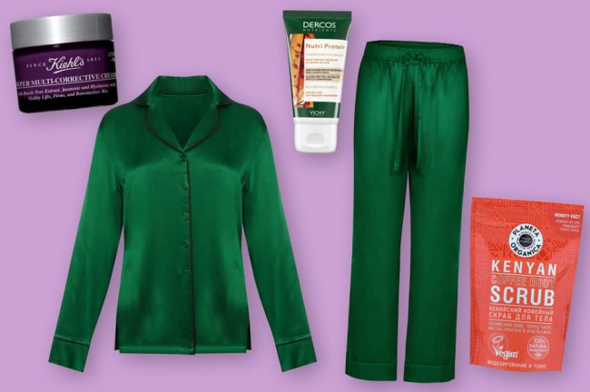 Пижама Incanto; питательный шампунь, Vichy; подтягивающий крем, Kiehl's; скраб, Planeta OrganicaБельевой стиль — один из самых главных (пусть и для многих спорный) трендов последних сезонов. Стилисты предлагают носить пижамы (и вещи, напоминающие пижамы) на прогулки и работу, так что если у тебя домашний офис, сделать селфи для коллег в пижаме не будет преступлением.