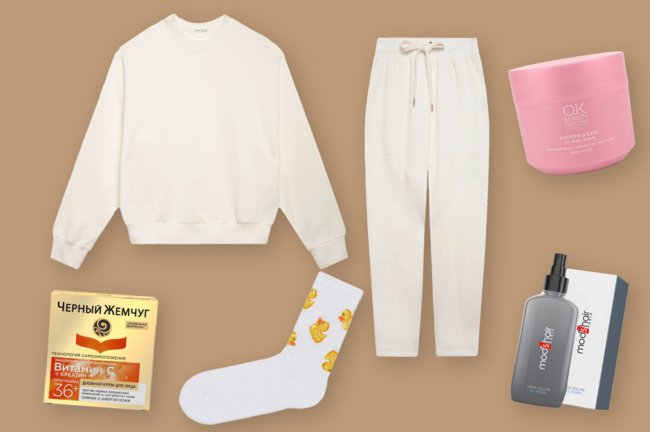 Брюки и свитшот Oysho; носки H&M; скраб для тела, OK Beauty; дневной крем для лица, Черный жемчуг; объемный спрей для волос, Mod's HairЕсли тебя раздражает переодеваться, чтобы выбежать из квартиры за продуктами, лекарствами или выкинуть мусор, выбирай комплект, в котором можно выйти из квартиры. В первую очередь важен не внешний вид, а тепло — брюки должны быть достаточно длинными, а футболку лучше заменить на свитшот.