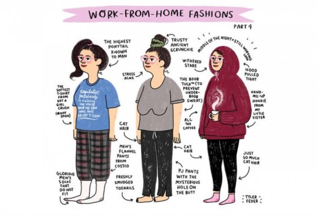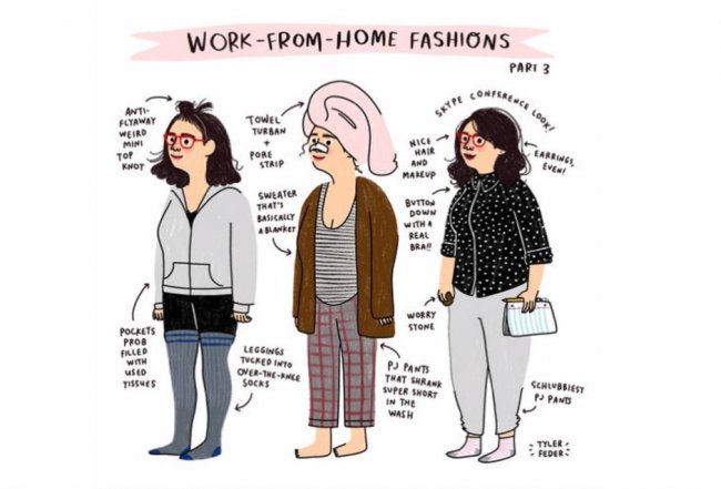 Иллюстратор: Tyler FederГотовься к большой распродаже на AliExpress: все тренды сезона со скидками!Следующая тройка: бомбер (а в карманах — куча салфеток), легинсы и гольфы; пижама со старым кардиганом; пижамные штаны, бюстгальтер и блузка (а все потому, что девушка собралась разговаривать по скайпу с коллегами).