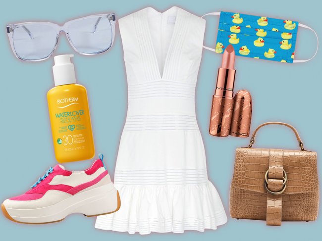 Платье 8 by YOOX, сумка и очки Alena Akhmadullina, кроссовки Vagabond, маска Funny Socks, помада, MAC, солнцезащитное молочко, Biotherm.На этой неделе наконец-то пришло настоящее лето: власти начали поэтапно отменять режим самоизоляции. Официально на лавочках пока сидеть нельзя, зато гулять можно поехать куда угодно — и в парки, и просто по центральным улицам городов. Можно полюбоваться и на фонтаны — в Москве их запустили 10 июня.