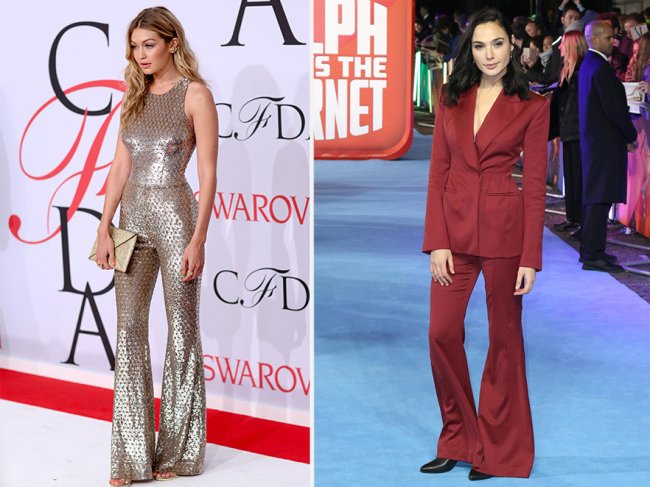 Супермодель Джиджи Хадид в брюках клеш и израильская актриса Галь Гадот в костюме с брюками клеш. Legion-media.ruВо втором десятилетии XXI века постепенное возрождение интереса к расклешенным брюкам началось опять же с джинсового сегмента. В самом начале 2010-х bootcut jeans вернулись в ассортимент популярных брендов — например, Gap. Постепенно из сугубо джинсовых марок штаны перебрались и в масс-маркетные: так, уже пару лет назад женские клеши можно было обнаружить на рейлах H&M. По результатам опроса, проведенного в конце весны 2020 года, брюки клеш вошли в десятку самых популярных женских вещей всех времен.
