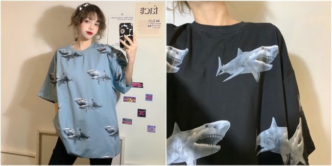 Нажми на фото, чтобы узнать больше!Объемная футболка с акуламиОбрати внимание на расцветку