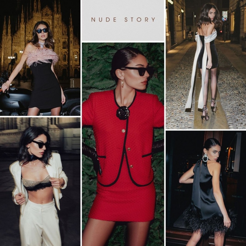 Nude Story представил коллекцию в духе классического шика миланского street-fashion. В линейку вошли вечерние платья с цветочным принтом, розовыми перьями, объемными бантами и тонкими цепочками. Также представлены классические брючные костюмы с укороченными жакетами, твидовый жакет и юбка в красном цвете, шелковые блузы на завязках, юбка и брюки из экокожи, кардиган с перьями и два корсета. Потом любой из этих образов можно смело внедрять в 2023-ый на фэшн-меропроятие или свидание.