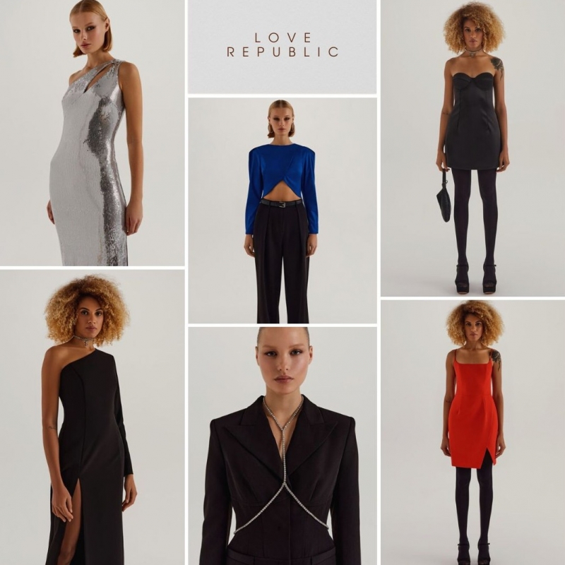 У Love Republic можно найти как классические модели вечерних платьев, так и дерзкие мини с пайетками. Главные мастхэвы - двубортный смокинг с атласными лацканами, платья-футляры, комбимнезоны с открытыми плечами и цепочка для тела со стразами. Главные цвета - черный, красный, синий, серебряный и золотой. Многие модели потом можно носить в повседневной жизни весной!