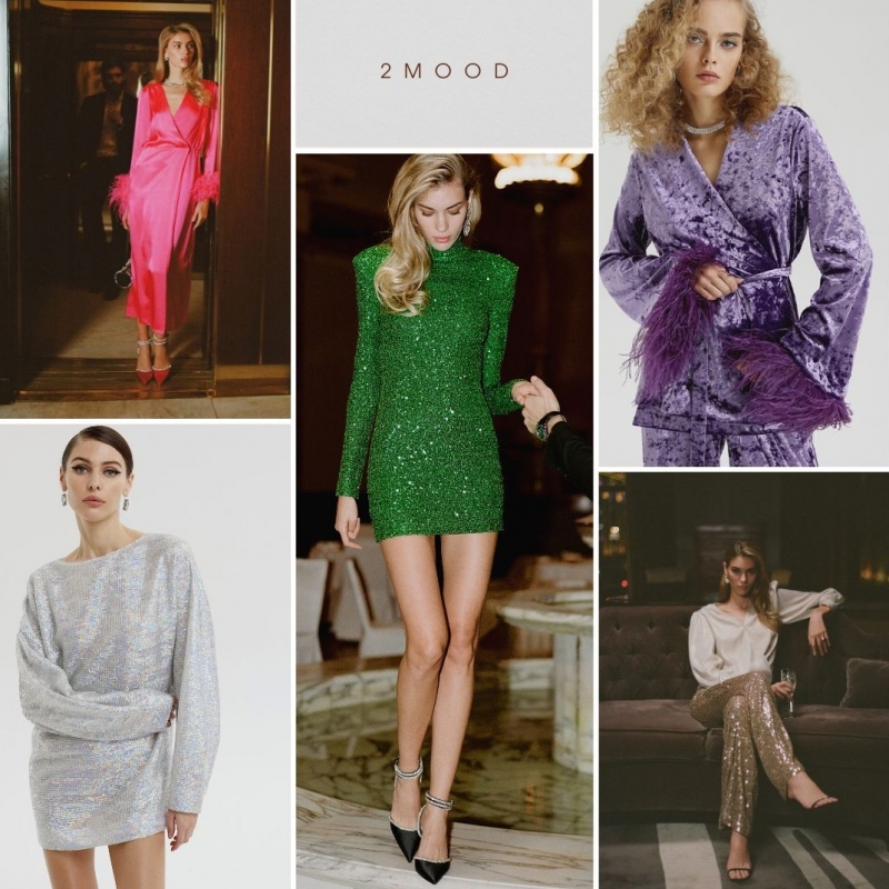 2 Mood предлагает встречать Новый год в сияние нулевых. Яркие цвета, перья, стразы – все это можно найти в новой коллекции бренда. Главные хиты - атласное платье макси с перьями, закрытое мини с блестками и золотые боюки-палаццо, которые можно сочетать с однотонной блузой или лонгсливом. И важно, что к наряду можно сразу подобрать и обувь с аксессуарами: в линейке представлены сверкающие туфли и сумки, а также массивный чокер с белоснежной розой.