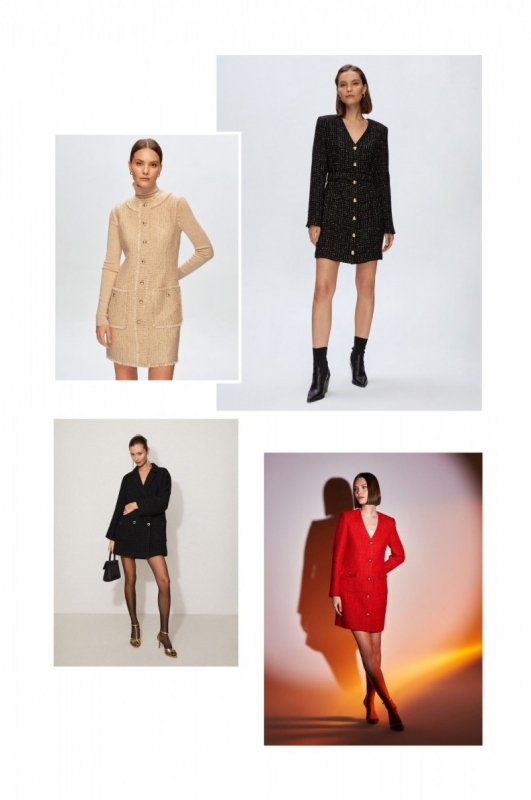 Комментарий Эльвиры Янковской: «Твид − фирменная ткань Chanel. Платья из твида обладают магией утонченности и элегантности, особенно в сочетании с высокими ботфортами. Такой образ идеально подойдет для работы и деловых встреч».