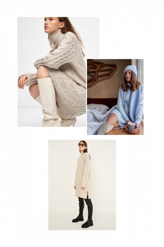 Комментарий Эльвиры Янковской: «Вязаное платье − необходимая часть гардероба зимой. Многие считают этот образ скучным, но модные тенденции опровергают это мнение. Свободный фасон платья можно смело сочетать с рубашкой под низ или использовать пояс. Объемные рукава добавят нотки элегантности. Также разнообразить образ помогут цепи-украшения. Если хотите добавить загадочности и мистики, прикрепите брошь-цветок, а если нужно выделиться из топлпы, оберните вокруг силуэта несколько ремней».