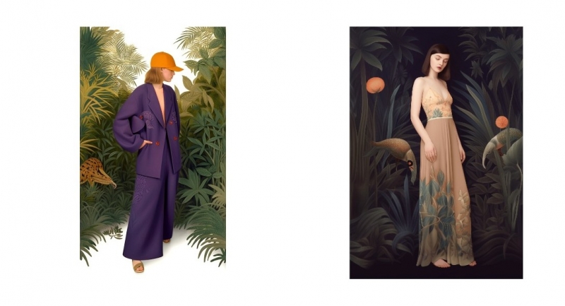 Лукбук включает как изображения реальных луков Spring-Summer 2023, так и созданных ИИ «по мотивам» коллекции AKHMADULLINA. Они соединены со стилистикой картин Анри Руссо, приемы живописи которого близки бренду по манере работы с цветом, формой, линиями. Нейросеть сгенерировала также «архетипичные» образы моделей AKHMADULLINA и поместила их в нереальные природные пейзажи.