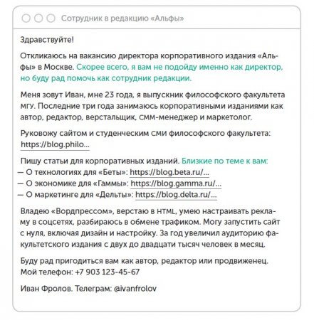 Хорошо, что Иван отобрал примеры работ, которые лучше всего соответствуют направлению компании. Если "Альфа" занимается финансовыми технологиями и сопровождением бизнеса, им вряд ли было бы интересно читать о воспитании детей или электронной музыке.