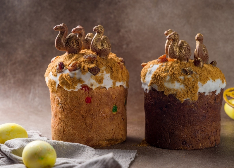 Кондитеры проект исполнят два вид куличей: ванильный с цукатами и белым изюмом и шоколадный с черносливом. И каждый - уникально украшен - по пустыне из песочной крошки бредут шоколадные верблюды.