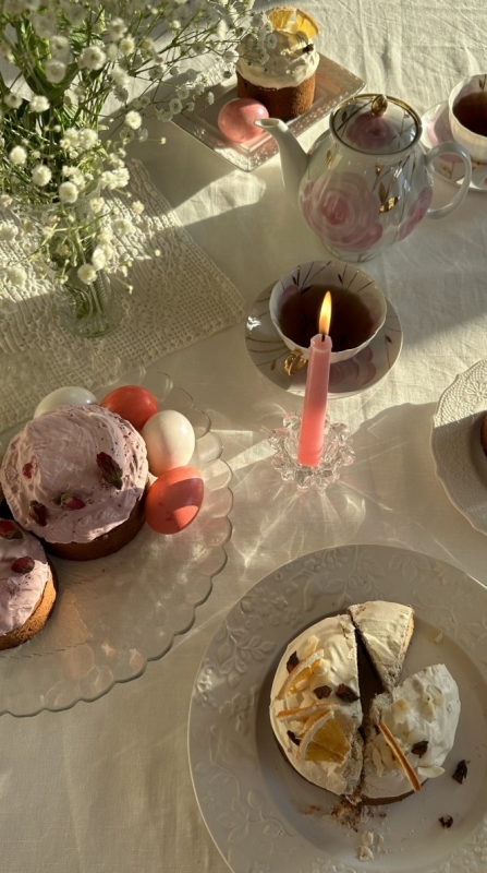 В основе нежнейшего теста: ароматные бадьян и чайная роза, бодрящие фрукты, ягоды, рисовая мука и перемолотый тростниковый сахар. Сверху кулич покрыт воздушной меренгой из фермерских яиц. Последний штрих — выкладка из натуральных фруктов, орехов и цветов, которые можно использовать для заварки душистого чая.