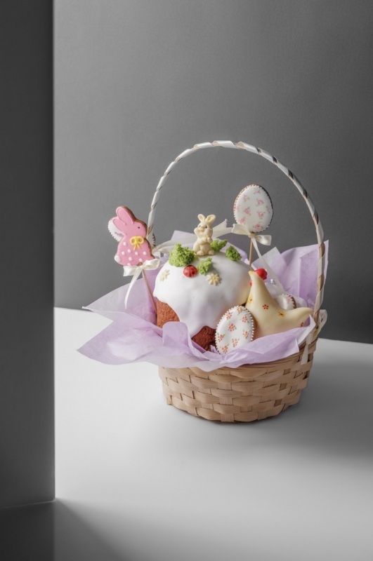 На куличе настоящий праздничный сюжет: пасхальный кролик ромашки и божья коровка. Свой секрет и у курочки из белого шоколада – внутри нее спрятаны шоколадные яйца. Вместе с курочкой и куличом в подарочные корзины складывают имбирные пряники и крашеные куриные яйца.