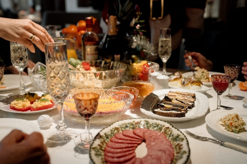 Меню ужина включает блюда, знакомые с детства: бутерброды с рижскими шпротами, красной икрой, холодец, оливье, «Сельдь под шубой», фаршированные яйца с килькой, заливное из судака, мясо по-французски, равиоло с ананасом, мандариновое желе и др.