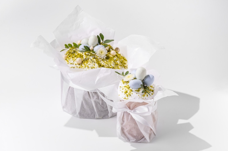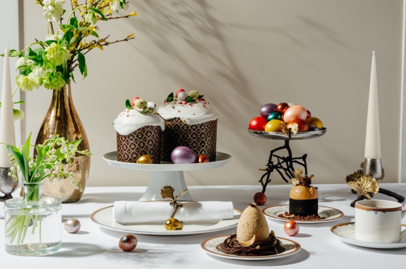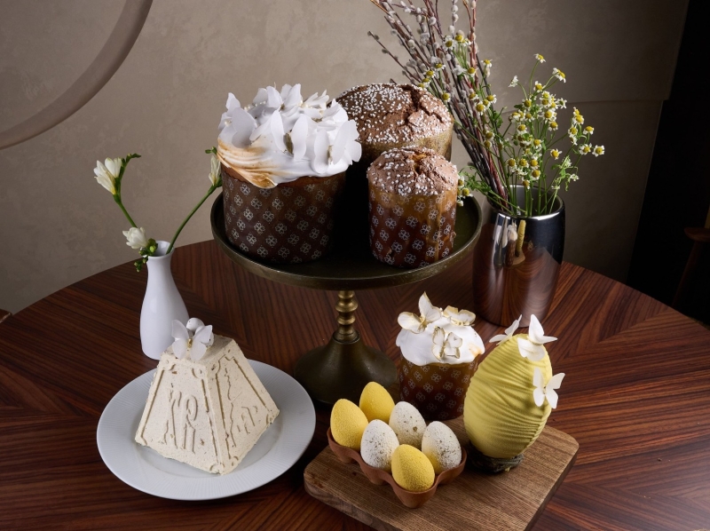 Шеф-повар Кристиан Лоренцини создал пасхальные блюда, идеально подходящие для праздничного стола и в качестве подарков близким. Куличи шеф выпекает по итальянским технологиям с 48-часовой выдержкой теста. В качестве декора – шапка из глазури, украшенная изысканной веткой сакуры и шоколадными яйцами, которые венчают композицию.