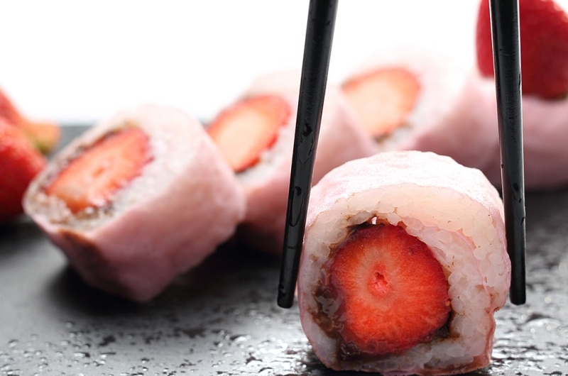 Смешайте "маринад" со сливочным сыром. Намажьте каждый кусочек суши небольшим количеством сливочного сыра и положите сверху 1 ломтик клубники. По желанию посыпте фисташками.