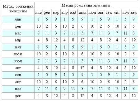 Существует также таблица, которая поможет будущим родителям зачать девочку или мальчика. Вам необходимо узнать число пары, чтобы знать, как воспользоваться таблицей. В горизонтальной строке отыщите месяц рождения мужа, а в вертикальной – жены. Цифра на пересечении месяцев рождения как раз будет означать число пары. К примеру, если мужчина родился в марте, а женщина - в мае, то их число 9.