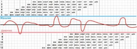 В таблице ниже найдите ваше число и посмотрите на графике вероятности зачатия ребенка определенного пола. Чем больше колебания графика, тем больше вероятность зачать девочку или мальчика. В случае с нашим примером, парой с числом 9, вероятность зачать девочку больше в мае.