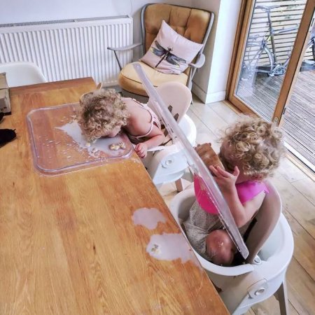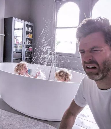 А здесь Саймон рассказывает тонкости воспитания. Он просто попросил дочерей не брызгаться водой в ванне, ведь мама будет ругаться. Они послушались.
