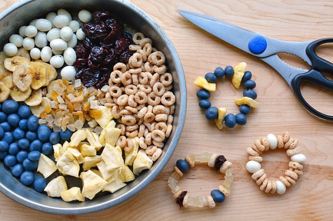 Для начала нужно собрать ягоды фрукты, которые растут в саду. Фрукты помыть и порезать на небольшие кусочки. И затем при помощи иглы нанизать их на нитку, чтобы получился браслет. Можно также использовать для браслета колечки или шарики из злаковых завтраков.