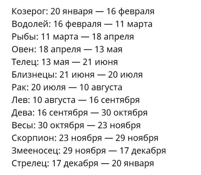 Если факт о наличии нового знака Зодиака Змееносце подтвердится, то другие знаки перетасуются. В таблице ниже можно посмотреть, как это будет выглядеть: