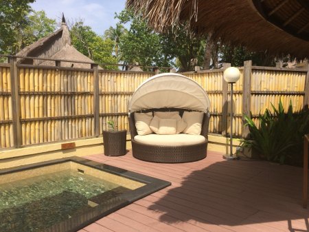 От дверей небольшой, но уютной виллы в стиле французского колониализма до кромки волн всего двадцать шагов по ослепительно белому песку. До личного бассейна и джакузи, которые есть на каждой вилле — три шага.