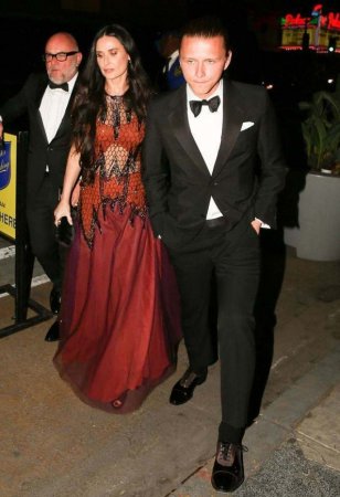 Папарацци запечатлели Гвинет, выходящей из лимузина в шикарном длинном бордовом платье от Giambattista Valli, и Брэда в белом смокинге.