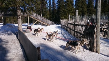 Затем после небольшого инструктажа катание по лесу на санках, запряженных собаками хаски. Для этих жизнерадостных активных собак бежать в упряжке по рыхлому белому снегу и тянуть ездоков — сплошное удовольствие!