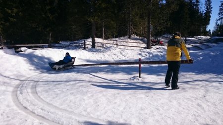 Здесь есть несколько ленточных подъемников и веселые препятствия для обучения катанию.