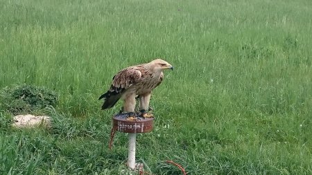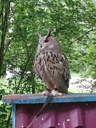 Большинство хищных птиц сидят не в клетках, а просто за небольшим забором, привязанные за ногу. Наблюдать за ними можно с близкого расстояния, но через забор лучше не лезть — птицы все же хищные.