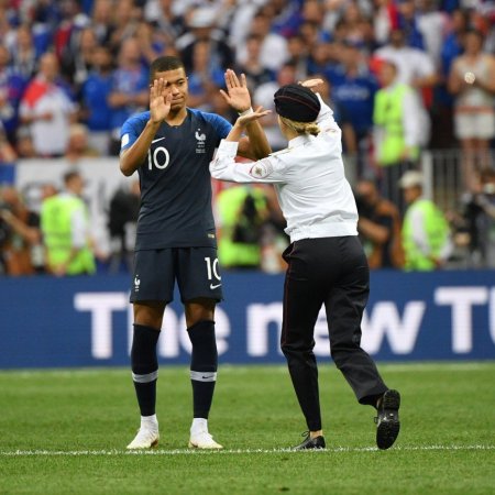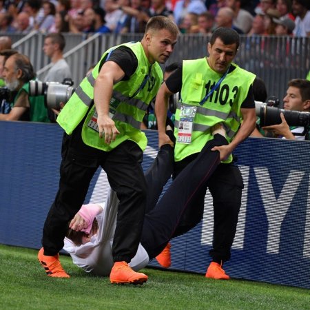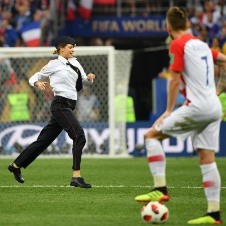 В воскресенье, 15 июля, во втором тайме игры между сборными Франции и Хорватии произошла незапланированная пауза. Четверо неизвестных ворвались на футбольное поле, помешав тем самым игре. Впрочем, заминка оказалась непродолжительной и нарушителей порядка быстро выпроводили со стадиона. Как выяснилось впоследствии, отчаянными болельщиками оказались активисты Pussy Riot, которые провели акцию «Милиционер вступает в игру». К слову, именно форма правоохранительных органов и позволила им исполнить эту выходку, и нарушители были остановлены уже только после того, как выбежали в центр поля.
