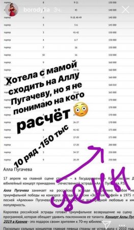 "Хотела с мамой сходить на Аллу Пугачеву, но я не понимаю, на кого расчет", - прокомментировала Бородина цену билетов. Справедливости ради стоит отметить, что все билеты с официального сайта были раскуплены буквально спустя несколько часов после того, как поступили в продажу, а сейчас их продают перекупщики, устанавливающие гораздо более высокую цену.