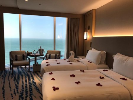 Весь дизайн Jumeirah Beach Hotel вдохновлен близостью моря, песка и парусников — получилось теплое и уютное пространство природных цветов: в белых, бежевых и синих тонах. И маленькая золотая уточка в ванной — ждёт, когда придется время купаться в пушистой пене.
