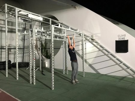 Снаружи — еще один зал с уличными тренажерами, где можно лазать, качать железо или нагружать руки с помощью каната для кроссфита.