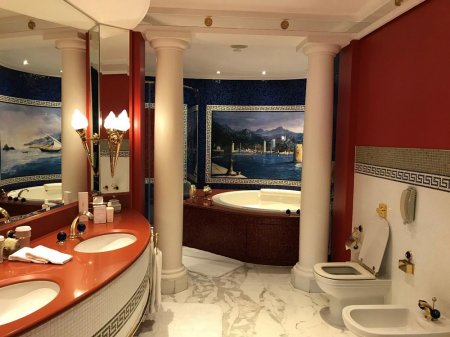 Витая лестница ведет в спальню, рядом с ней — ванная, в которой хочется жить. Интерьеры — дворцовые: мозаичные стены, позолоченные аксессуары, мягкая кожаная подвесная скамья, и джакузи под большим панно, на котором можно разглядеть достопримечательности из всех семи эмиратов ОАЭ. И большие полноценные флаконы косметики французского дома Hermes, которые, разумеется, все радостно забирают с собой — от таких подарков не отказываются даже взыскательные туристы, благодарно упоминая их потом в отзывах на сайтах.