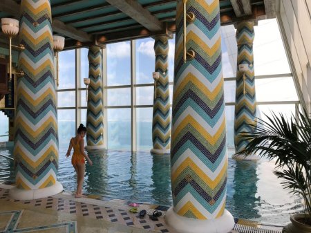 В женскую ведет отдельный коридор с разноцветными орнаментами, как в дворцовых гаремах, на входе — свежие лимонады с огурцом или с апельсинами и кардамоном. Лепестки роз в чаше для ног, выбор ароматного натурального масла для процедуры — и вот уже умелый массаж опытной мастерицы расслабляет, уплываешь в сон... И выплываешь уже в облаках — точнее, в бассейне под небесами, с мозаичной плиткой, деликатно поблескивающей золотом, и потрясающими видами на острова Пальм-Джумейра.