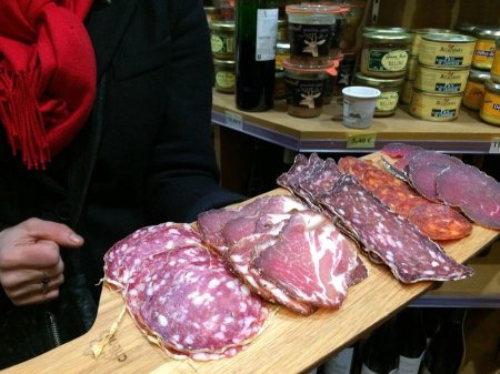 После следует мясная лавка, потом царство конфитюров — которые бывают не только сладкими, впрочем, и сладкие французы охотно используют для маринования мяса перед запеканием. Например, белый персик подойдет к свинине, а ягодный конфитюр с шампанским можно есть по утрам с хлебом, а можно добавить к темному мясу.