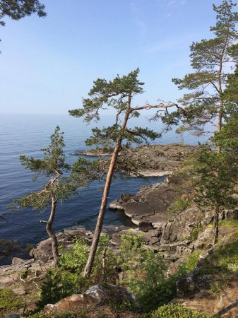 Наверное, экскурсоводы рассказывают по пути много интересного. Но мы с легкостью принесли в жертву неполученные знания, получив взамен возможность идти по чудесному лесу (пусть не по тропе, а по торной дороге) в тишине и одиночестве. Дорога то поднимается вверх, то ныряет вниз, в пение птиц вставляют свои нескончаемые арии алчные валаамские комары. Я с трудом узнаю местность и ностальгирую по прошлому. Но вот справа остаются развалины финской разведшколы и перед нами — Ладога и скалы.