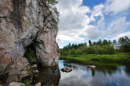 И вот он — "Дыроватый камень" или (второе название мне нравится больше) "Пьющая лошадь". Действительно, ну очень похоже! Будто лошадь опустила свою огромную морду в реку и не может напиться. А все это река Серга, вымывая известняки, сформировала причудливые формы скал.