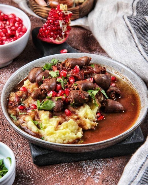 Процесс приготовления:1. Сердечки вымыть, срезать лишний жир. 2. Помидоры нарезать некрупными кубиками. 3. В миске перемешать сердечки, помидоры и все сухие специи. Оставить мариноваться 10 минут.4. Сковороду раскалить на сильном огне и выложить в нее сердечки вместе с маринадом и измельченным чесноком. Готовить 5 минут. 5. Снять с огня, добавить гранатовый соус и кинзу. Перемешать и дать постоять минут 10. 6. Подавать с картофельным пюре. Добавить зерна граната.