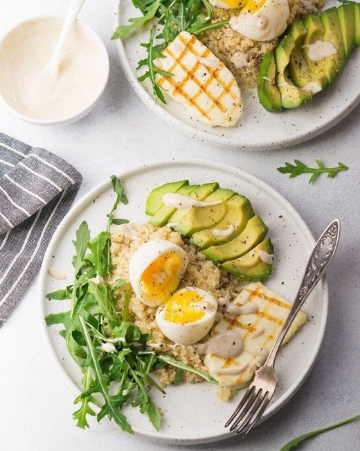 Салат с киноа, яйцом и авокадо Ингредиенты (на 2 порции):Для салата:Отварной киноа 100 грЯйцо 2 штАвокадо 1 штАдыгейский или сыр халуми пара ломтиковРуккола или другая зелень по вкусуСоль, черный перец по вкусуДля соуса:Кефир 150 млТахини или кунжутный урбеч 2 ст. л.Соль и черный перец по вкусуОливковое масло 1 ст. л. Салат с киноа, яйцом и авокадо Процесс приготовления: 1. Сыр обжарить на гриле, яйцо отварить всмятку — 3 минуты после закипания воды, затем залить холодной водой.2. Все ингредиенты для соуса смешать в соуснике.3. На тарелке для подачи выложить киноа, сыр, зелень, нарезать ломтиками авокадо, положить сверху разрезанное яйцо всмятку, все щедро полить соусом.
