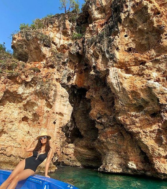 В кадре Сальма позирует, сидя на краю синей лодки в черном купальнике от Alexander McQueen. Восхитительный скалистый фон со спускающейся по нему зеленью и лазурь океана, сверкающую под палящим солнцем, выгодно дополнила лучезарная улыбка брюнетки, покорив сердца ее поклонников ничуть не меньше, чем ее стройная точеная фигура. Оставлять под фотографией подпись Хайек не стала, решив не сообщать миру о том, где именно она проводит отпуск. Но это было и неважно, ведь все внимание армии фанатов было сосредоточено на аппетитных формах мексиканской актрисы.