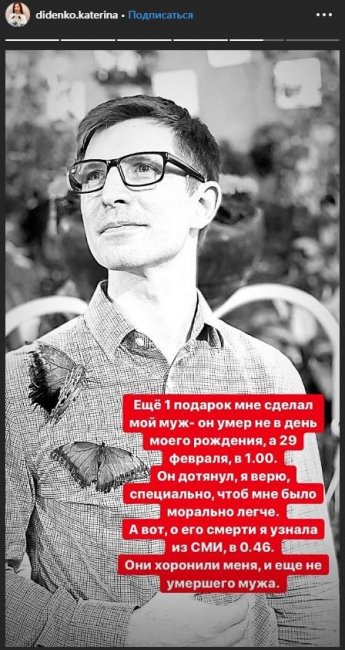Блогер Екатерина Диденко с мужем Валентином Празднование 29-летия Екатерина Диденко запомнит на всю жизнь. Популярный блогер, который, казалось бы, должен отлично знать химию, потеряла мужа, погибшего у нее на глазах из-за реакции сухого льда с водой. И хоть популярность вдовы растет с каждым днем, сама она умоляет отписаться от нее всех «стервятников», осуждающих ее за случившееся.В новых сториз Диденко умоляет дать ей возможность спокойно оплакать мужа, заявляя также, что социальные сети не бросает по рекомендации психотерапевта. Блогер Екатерина Диденко с мужем Валентином Врач настоятельно советует Екатерине продолжать рассказывать о своих чувствах и эмоциях, чтобы быстрее справиться с горем и депрессией. Но последнее заявление аптечного ревизорро, как сама себя называет Диденко, просто не могла остаться без внимания. Екатерина, рассказывая про подарок погибшего мужа к своему дню рождения, упоминает некий портрет, но затем сама себя поправляет, указывая, что последним даром Валентина Диденко ей стала его кончина в час ночи 29 декабря. По мнению блогера, Диденко намеренно «дотянул» еще час, чтобы не испортить жене праздник. Погибший Валентин Диденко