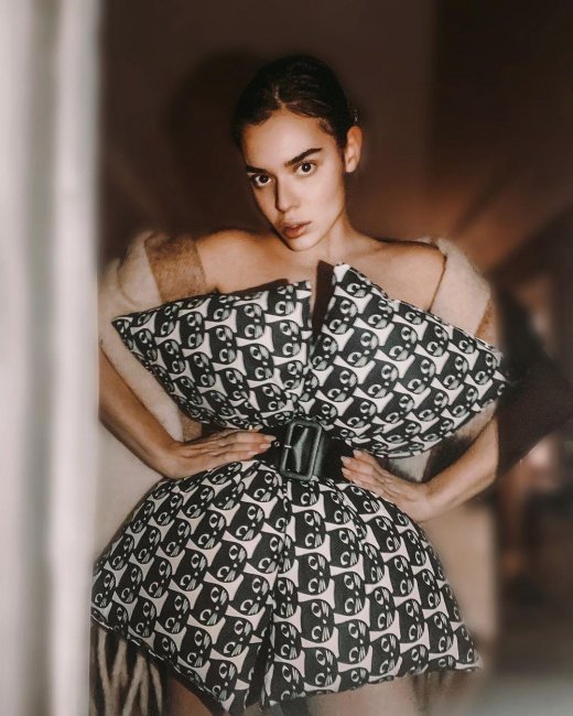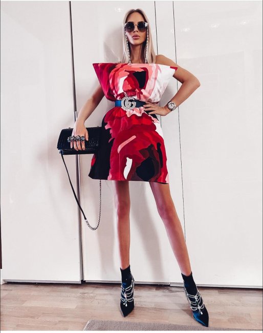 А Мария Погребняк выбрала яркую подушку с цветочным принтом, а получившийся гламурный образ дополнила массивным ремнем со стразам, стильными очками и обувью.