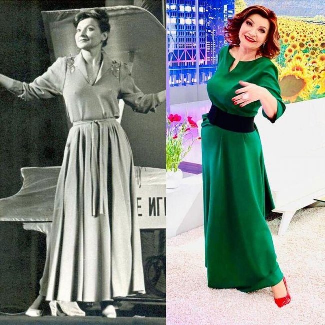 На черно-белом снимке Елена Григорьевна выступает на сцене в длинном женственном платье, подчеркивающем ее тонкую талию. Для сравнения артистка сделала коллаж из архивного и современного фото, продемонстрировав, что сейчас выглядит такой же изящной и стройной, как и тридцать лет назад. Сама Елена Степаненко призналась, что и ее стиль мало изменился за прошедшие годы.
