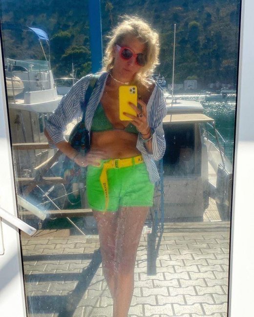 На одном из снимков Бондарчук позирует у зеркальной двери в порту. На звездной блондинке ярко-зеленые мини-шорты, зеленый купальник и распахнутая бело-голубая полосатая рубашка офисного типа. На снимке отлично видно, что Светлана успела хорошо загореть, а также слегка поправиться в области живота.