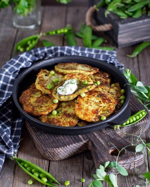 Автор фото и рецепта Юлия Аханова: instagram.com/julia_ahanova/ Ингредиенты на 16-18 шт: Кабачок — 3 штСыр твердый — 100 гЯйцо куриное — 2 штЗеленый горошек — 60-70 гМука пшеничная — 4 ст.л.Чеснок — 2 зубкаУкроп — небольшой пучокСоль и перец — по вкусуМасло растительное — 3 ст.л. Автор фото и рецепта Юлия Аханова: instagram.com/julia_ahanova/ Процесс приготовления: 1. Молоденькие кабачки натереть на мелкой терке, посолить и оставить на 15 минут.2. Тем временем натереть на мелкой терке сыр, мелко нарезать укроп.3. Отжать кабачки от влаги. Добавить к ним яйца, натертый сыр, измельченный укроп, чеснок, пропущенный через пресс, перец по вкусу, зеленый горошек и муку. Все тщательно перемешать.4. Разогреть сковороду с растительным маслом, выложить кабачковое тесто и обжарить на медленном огне до румяной корочки.5. Кабачки можно не жарить, а запекать в духовке. При 170 градусах примерно 20 минут.