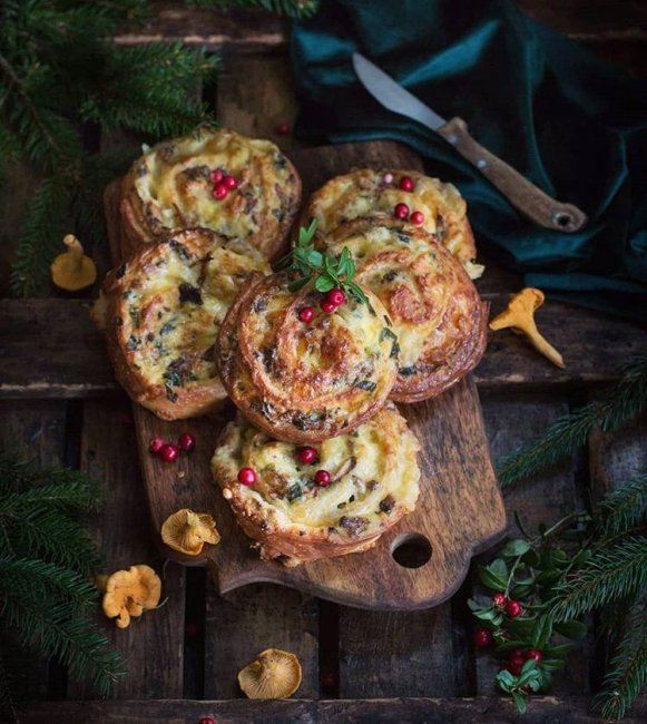 Автор фото и рецепта Анжелика Зоркина: instagram.com/angelika_sorkina/ Ингредиенты:Тесто: примерно 550 г муки30 г сахара7 г соли2 яйца50 г сливочного масла10 г сухих дрожжей300 мл молока Начинка: 1 небольшой лук-порей или большая луковица800 г грибов (любых)2 ст.л. растительного масла1 ст.л. с горкой жирной сметаны1 зубчик чеснокащепотка тимьянасоль, перец по вкусу400 г моцареллы или другого хорошо плавящегося сыра Для смазывания булочек: 2 яйца1 ст.л. сметаны Автор фото и рецепта Анжелика Зоркина: instagram.com/angelika_sorkina/ Процесс приготовления: Тесто: 1. Растапливаем сливочное масло, добавляем в него молоко и слегка нагреваем, смесь должна быть очень теплая, но не горячая. Добавляем в нее слегка взбитые яйца.2. Муку насыпаем в большую миску или чашу комбайна, добавляем сахар, дрожжи, соль, перемешиваем и вливаем молочно-яичную смесь. Замешиваем тесто минут 15 на низкой скорости комбайна или вымешиваем руками. 3. Накрываем тесто полотенцем и ставим в теплое место на расстойку на 1,5 часа, обминаем и расстаиваем еще минут 45-60. Начинка: 1. Грибы (смесь лисичек, белых и прочих) нарезаем и жарим в масле. Выпарить жидкость, подрумянить грибы и добавить нарезанный на колечки лук-порей, посолить, поперчить, выдавить зубчик чеснока, посыпать тимьяном, немного потушить все вместе и в самом конце положить ложку с горкой жирной сметаны (этот шаг можно опустить, но со сметаной вкуснее, а калорийность булок и без нее зашкаливает).2. Остужаем начинку. Сборка: 1. Раскатываем тесто в пласт толщиной примерно 3 мм.2. Раскладываем начинку — сначала грибы, затем сыр по всему пласту.3. Заворачиваем в рулет, нарезаем примерно на 12 частей.4. Выкладываем на противень и ставим в теплое место на расстойку на 30 минут.5. Выпекаем при 180°С до золотистого цвета около 18 минут, предварительно смазав яйцами, смешанными с ложкой сметаны. Смазываем и края булочек и верх.