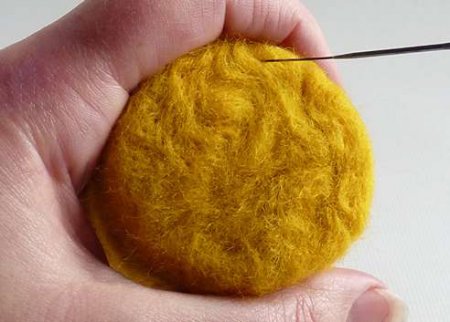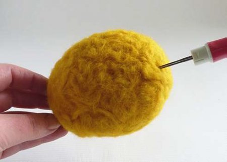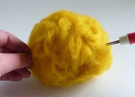 1. Возьмите прядь шерсти основного цвета длиной 70 см. Скомкайте в шарик, спутывая волокна. Начинайте валять двумя или тремя иглами, поворачивая по мере уваливания, чтобы деталь получалась равномерно круглой.