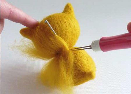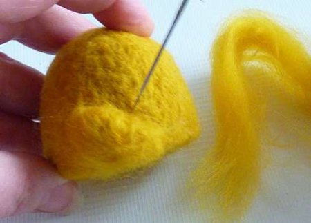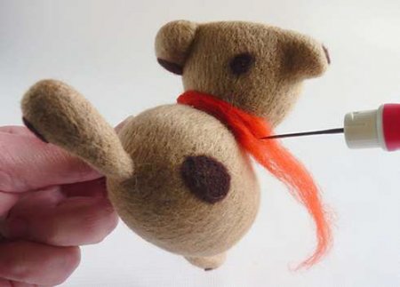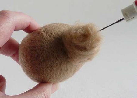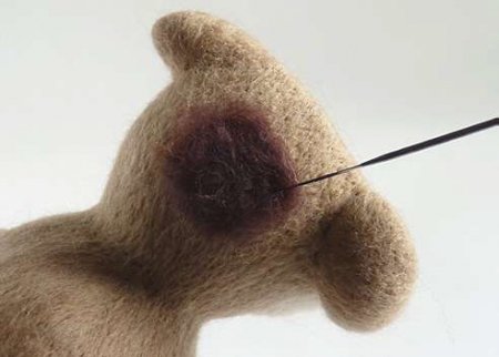 3. Если вы делаете щенка, перед тем, как приваливать ушки, сформируйте круглую мордочку. Возьмите щепотку шерсти и приваляйте её прямо к голове, используя одну иглу.
